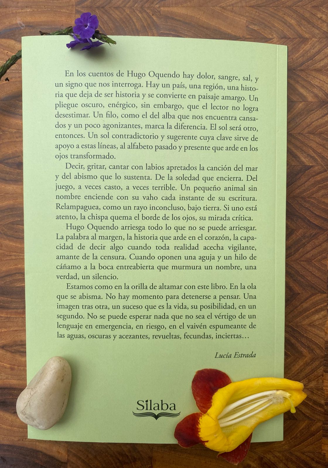 En los cuentos de Hugo Oquendo hay dolor, sangre, sal, y un signo que nos interroga. Hay un país, una región, una historia que deja de ser historia y se convierte en paisaje amargo. Un pliegue oscuro, enérgico, sin embargo, que el lector no logra desestimar. Un filo, como el del alba que nos encuentra cansados y un poco agonizantes, marca la diferencia. El sol será otro, entonces. Un sol contradictorio y sugerente cuya clave sirve de apoyo a estas líneas, al alfabeto pasado y presente que arde en los ojos transformado.