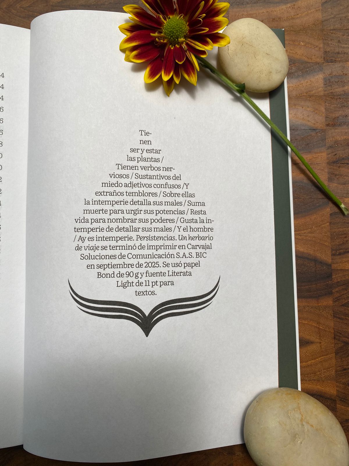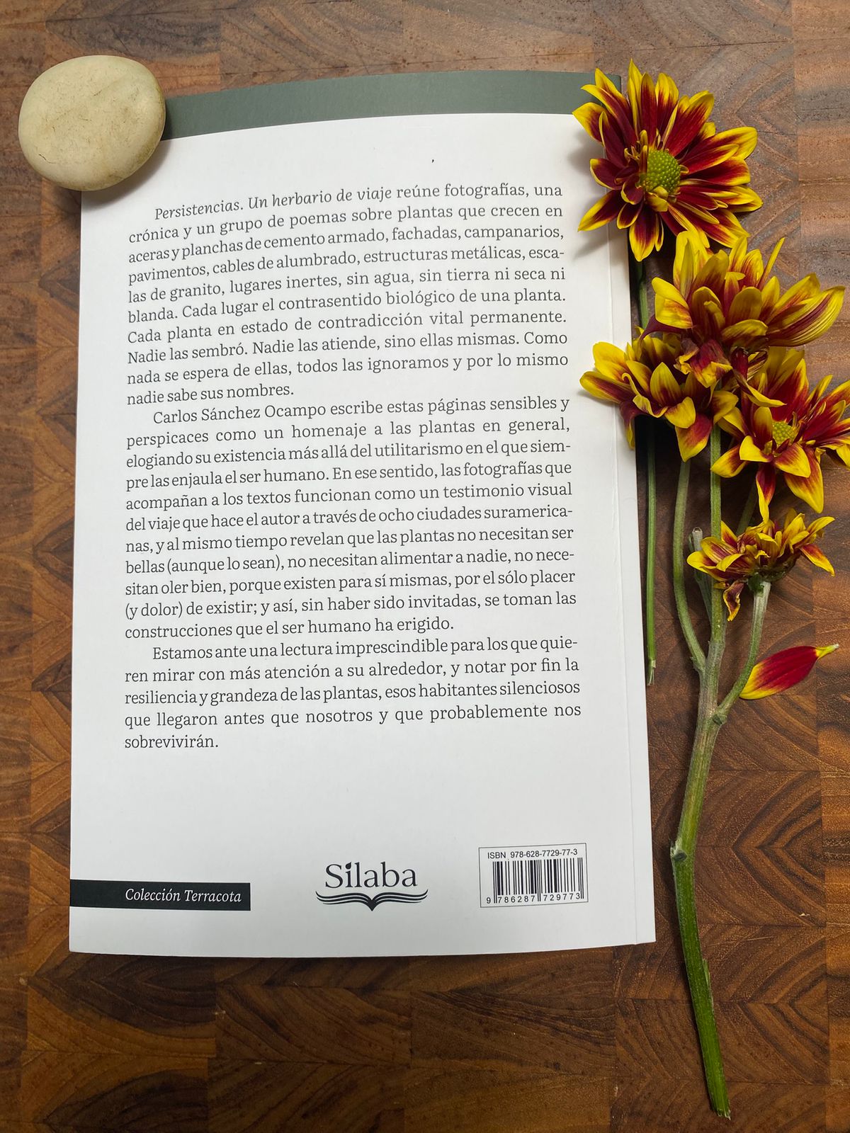 Persistencias. Un herbario de viaje reúne fotografías, una crónica y un grupo de poemas sobre plantas que crecen en aceras y planchas de cemento armado, fachadas, campanarios, pavimentos, cables de alumbrado, estructuras metálicas, escaleras de granito, lugares inertes, sin agua, sin tierra ni seca ni blanda. Cada lugar es el contrasentido biológico de una planta. Cada planta está en estado de contradicción vital permanente. Nadie las sembró. Nadie las atiende, sino ellas mismas. Como nada se espera de ellas, todos las ignoramos y por lo mismo nadie sabe sus nombres.
